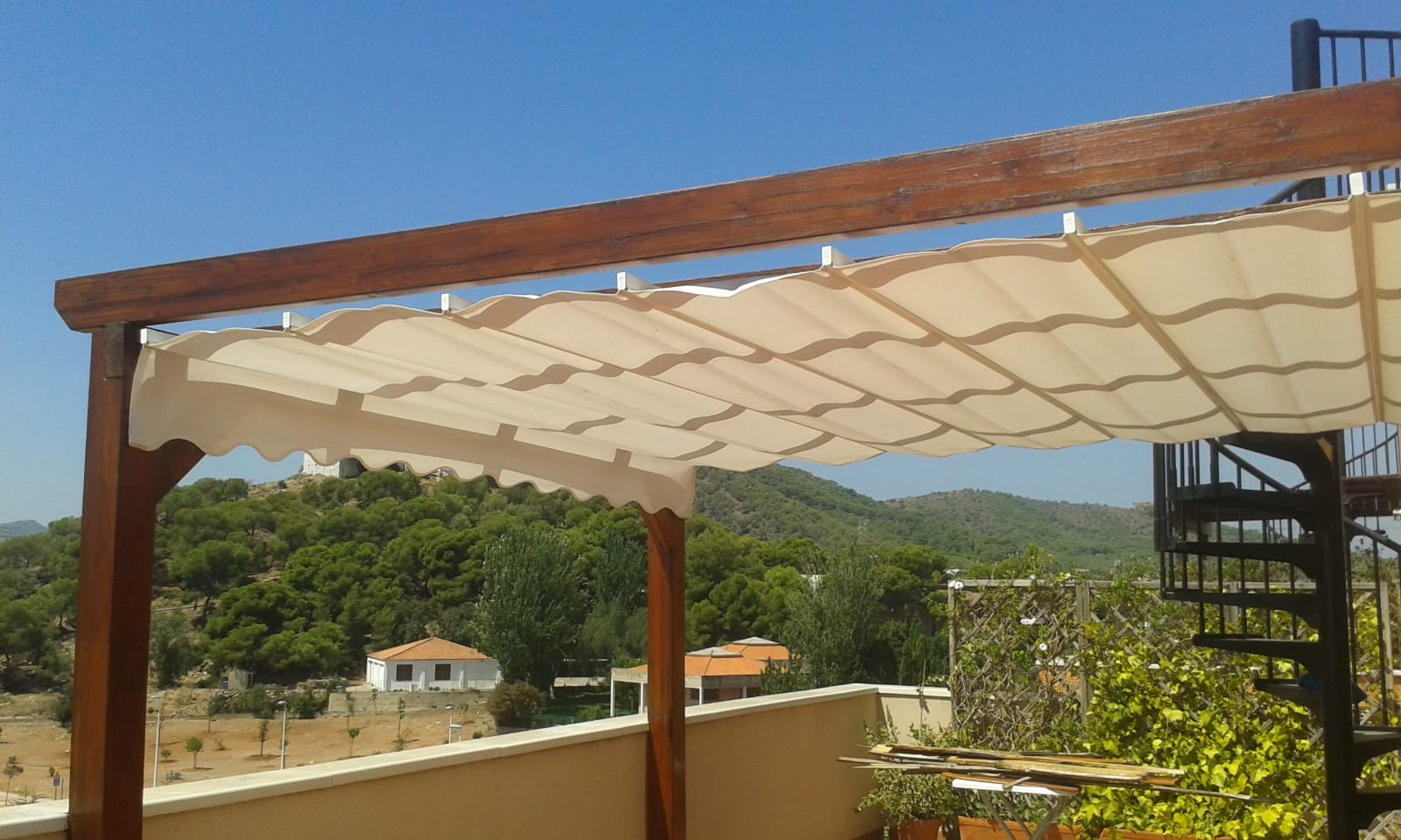PORCHE DE MADERA ADOSADO A PARED CON TOLDO CORREDIZO MANUAL CON GUÍAS.